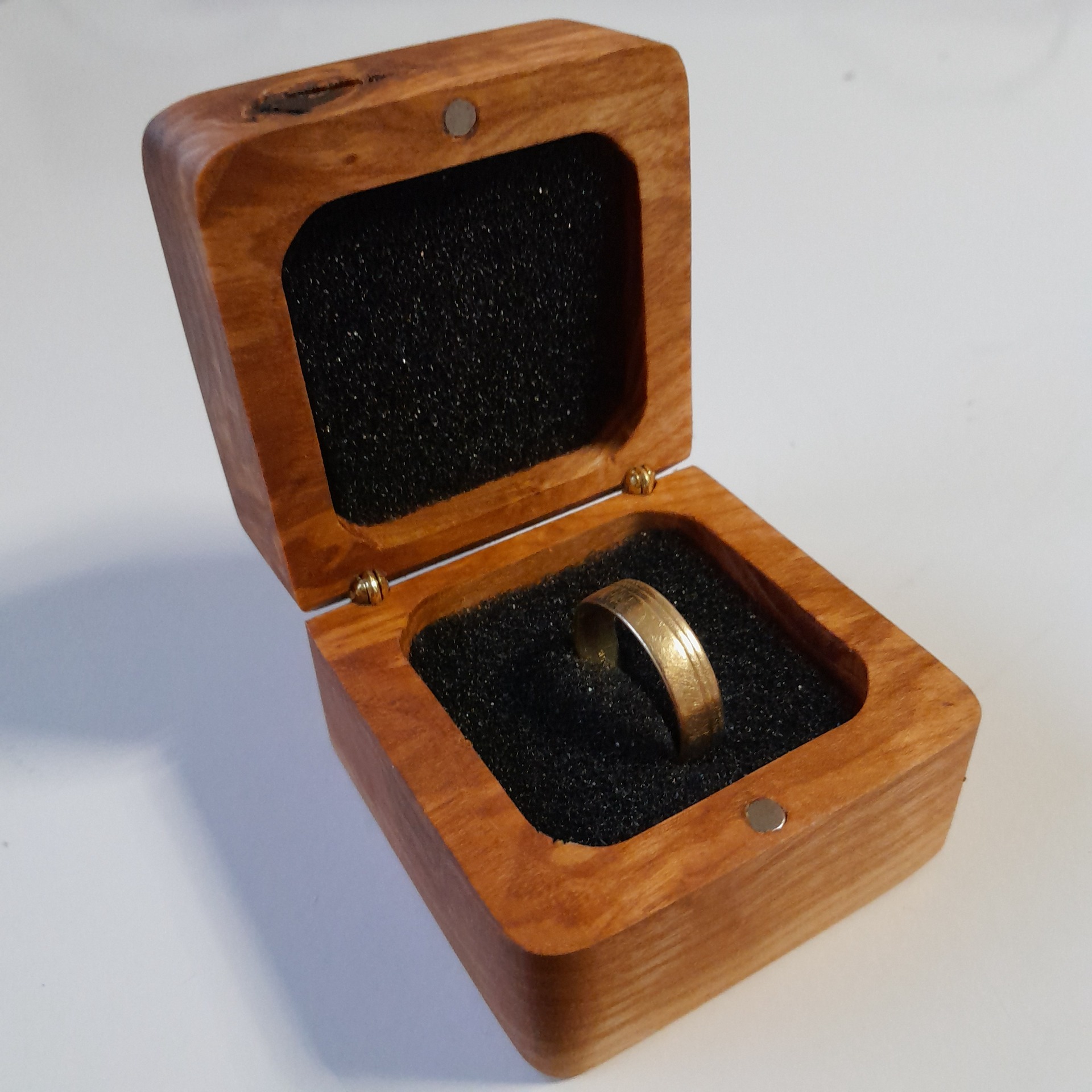 Die Ringbox misst 6 × 6 cm bei einer Höhe von 4,5 cm. Im Inneren befindet sich eine praktische Schaumstoffeinlage mit 3 cm hohem Auslass, die Ringe sicher fixiert und vor Kratzern schützt. Der klappbare Deckel schließt dank eines Magnetverschlusses sanft und zuverlässig.